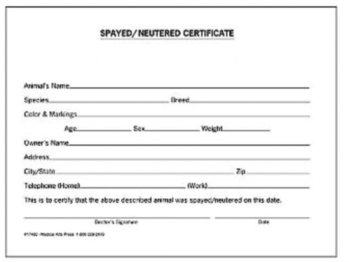 This proof declaring that your pet has been spayed or neutered may be in the form of a statement or receipt from the veterinarian, shelter, or clinic that performed the procedure.